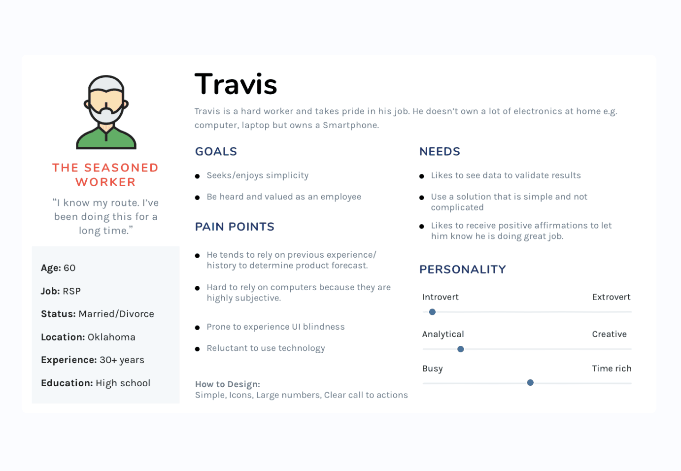 This project involved the most user testing I’ve ever led, over a year of travel across 9 states, meeting and testing with more than 45 frontline users. I brought their voices into leadership discussions, ensuring every design decision reflected real operational realities. To bridge empathy and evidence, I created an archetype document that humanized user personas and paired those stories with quantitative data from Grupo Bimbo’s analytics team.
